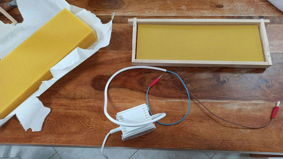 Wie lötet man Mittelwände richtig ein? Oben oder unten? Ich habe gelernt, dass die Mittelwände unten angelegt werden sollten, da ein oberer Spalt von den Bienen zugebaut wird. Zudem empfiehlt es sich, Mittelwände "handwarm" einzulöten. Andernfalls könnte es passieren, dass sich die Wände wellen, sobald sie "bewohnt und bewärmt" werden, was zahlreiche imkerliche Nachteile mit sich bringen würde.