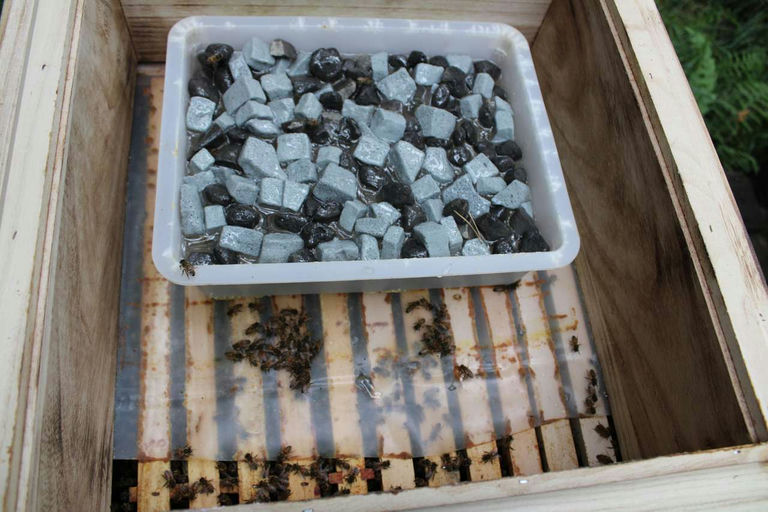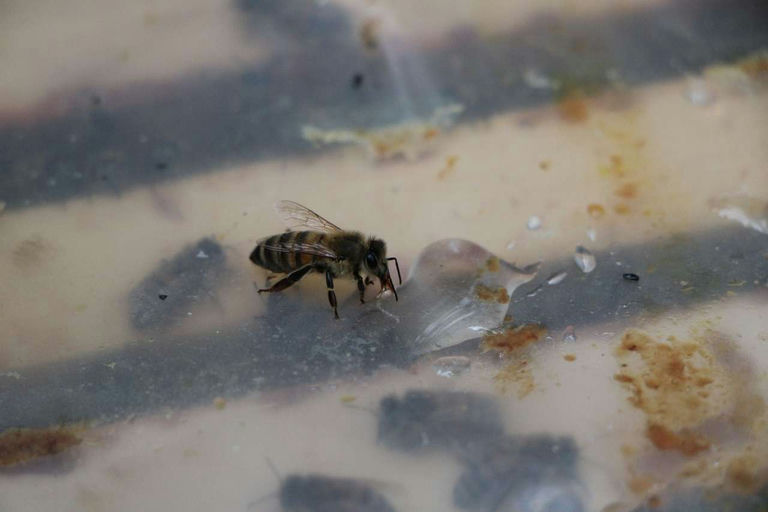 Das Bienenvolk hat sich toll entwickelt. Es sitzt jetzt auf einer kompletten Zarge und hat alle Rähmchen vollständig ausgebaut – optimale Bedingungen, um möglichst viel Futter einzulagern. Seit der Sommersonnenwende Ende Juni hat die Königin die Brutaktivität reduziert. Dies merkt man nun bereits an der Volksstärke. Dafür werden vermehrt Bienen aufgezogen, die deutlich länger leben als ihre Schwestern und auch nicht so stark in die Arbeiten im Bienenstock eingebunden werden. Sie haben die wichtige Aufgabe, die Königin durch den Winter zu begleiten und im Frühjahr das Volk wieder aufzubauen. Damit die Bienen ausreichend Futter für den Winter haben, werden sie gefüttert, da sie nun nicht mehr genügend Nahrung in ihrer Umgebung finden.