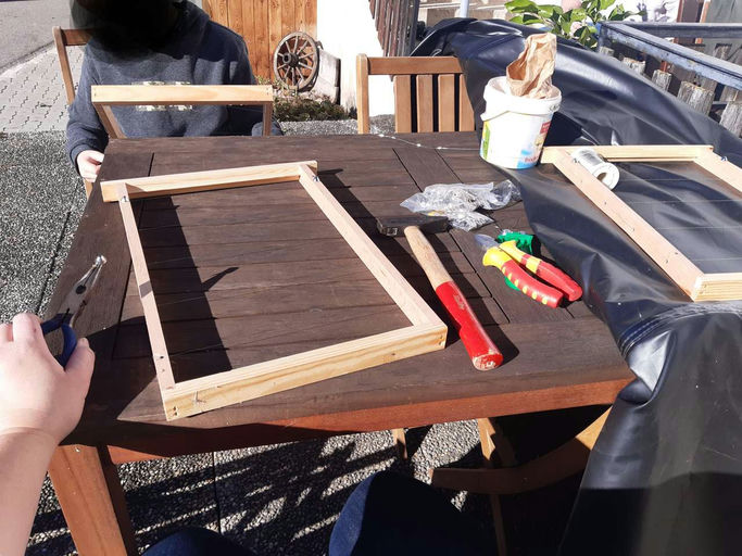 Herbstwetter? Nein. Hier in Feistritz am Wechsel herrschen Anfang November zumindest mittags spätsommerliche Temperaturen. Perfekt, um die Rähmchen für das nächste Jahr draußen vorzubereiten. Einige benötigen eine neue Bespannung mit Draht. Dieser hilft, die Waben zu stabilisieren, damit sie beim Schleudern des Honigs nicht kaputtgehen. Das ist wichtig, weil sie wiederverwendet werden sollen, denn Bienen wenden viel Energie auf, um Wachs zu produzieren und damit Waben zu bauen. Zwischen sieben und 13 Kilo Nektar werden für nur ein Kilo Wachs benötigt.
