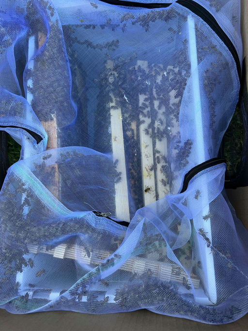 Anfang Juni erhielten wir die Nachricht, dass wir das Bienenvolk per Spezialtransport für lebende Tiere erhalten würden. Der Zeitpunkt war ideal, da wir ohnehin Urlaub hatten und das Wetter hervorragend war. Voller Vorfreude nahmen wir das Paket entgegen. Leider kam beim Öffnen der Versandbox die Ernüchterung: Die Rähmchen mit den Waben waren verrutscht, weil eine Halterung in der Box gerissen war. Einige Bienen wurden dabei leider gequetscht. Vorsichtig setzten wir alle Rähmchen mit den lebenden Bienen in die neue Beute um.