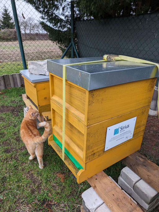 Ich bin so froh, dass meine Bienen jetzt ihr neues Zuhause auf unserem Grundstück gefunden haben. Wir haben darauf gewartet, dass es warm wird, damit die Traube beim Transport nicht auseinanderfällt. Wenn es warm genug ist, sitzen die Bienen nicht so dicht beieinander und können sich zurückziehen, falls sie doch herunterfallen. Und unsere Katze wird dafür sorgen, dass keine Maus sie stört. Die Haselnussbäume stehen bereits in voller Blüte und versorgen die Bienen mit Pollen und Nektar. Ich hoffe wirklich, dass die Tracht hier genauso gut wird wie auf dem Universitätscampus. Aber sicher ist, dass es jetzt viel einfacher sein wird, sich um die Bienen zu kümmern.