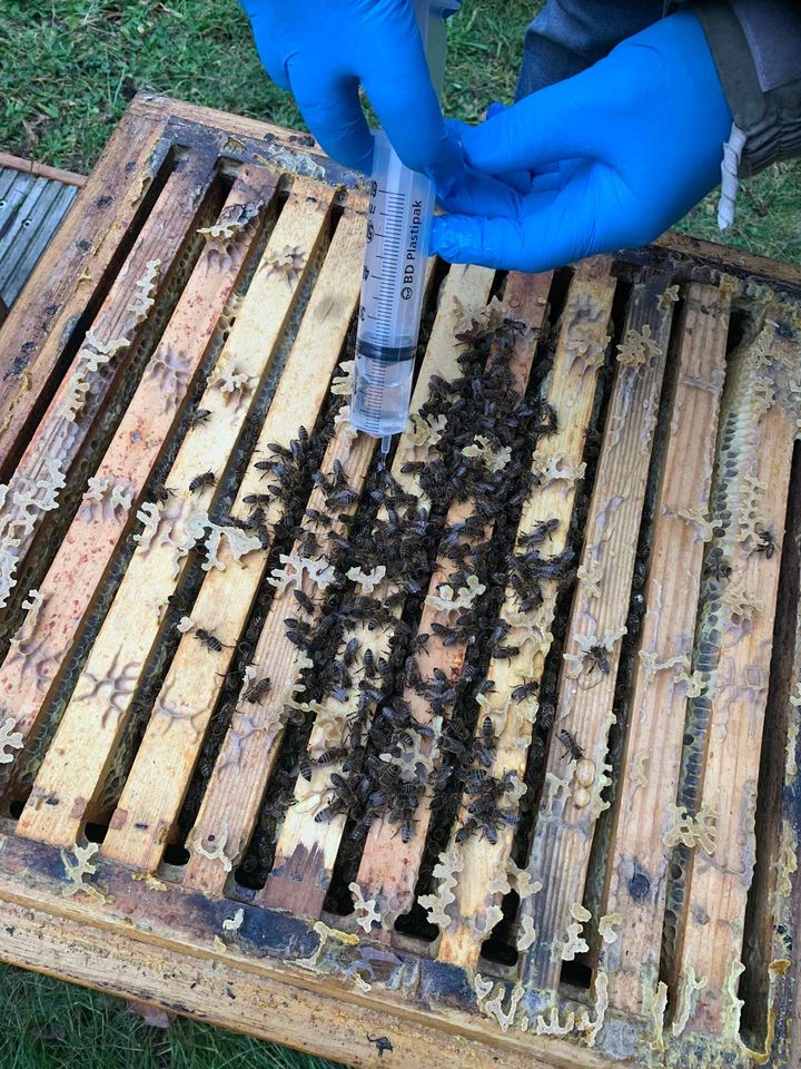 In diesem Monat haben wir die Oxalsäurebehandlung durchgeführt, indem wir die Säure auf die Bienen, die derzeit in einer Traube leben, getropft haben. Dies dient der Bekämpfung der Varroamilben. Zudem war einer der Deckel wegen des starken Sturms fast heruntergeflogen, obwohl er mit einem Stein gesichert war.