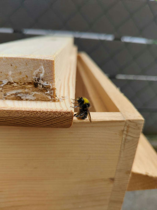 Neue Beuten sind besorgt und nun schon mit Lasur eingelassen. Bei der Arbeit habe ich sogar Besuch von einer Hummel gehabt. Damit auch meine KursteilnehmerInnen einen Blick auf die künftigen Bewohnerinnen werfen können, haben die neuen Behausungen bienendichte Fenster.