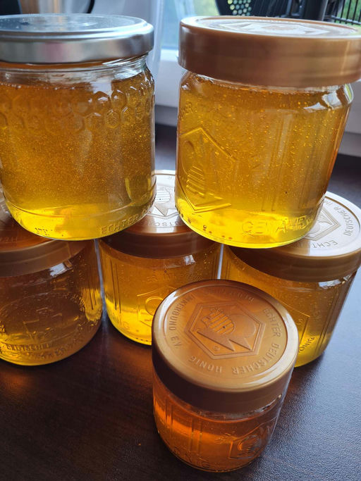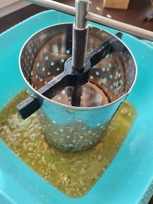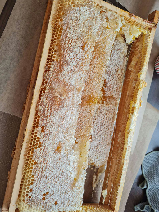 Unser Moselbienenvolk hat nach der ersten Honigernte noch einmal den Turbo eingelegt und ruckzuck den Honigraum ein zweites Mal gefüllt. Diese Waben habe ich für meine Bienenprojekte reserviert – zum Wabenhonig naschen. Jetzt wurde der Rest gepresst und für den Eigenbedarf abgefüllt. Lecker!