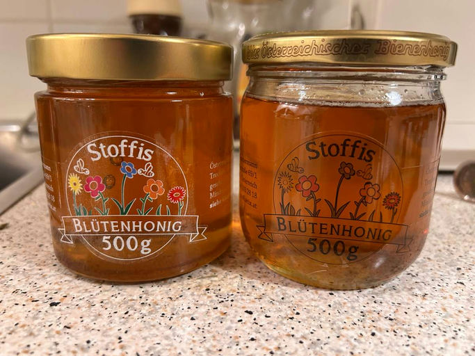 Die Bienen halten keinen Winterschlaf, aber sie bilden eine Wintertraube – und die sollte man möglichst wenig stören. Das heißt, wir versuchen, so wenig wie möglich in den Bienenstock zu schauen. Ganz geht es aber doch nicht. Nach dem ersten ernsten Frost, wenn die Königin eine Legepause macht, müssen wir die Bienen gegen die Varroa-Milbe behandeln. Ich verwende dazu eine Zuckerlösung mit Oxalsäure. Sonst ist auch viel zu tun. Wahrscheinlich das Schönste ist es, den geernteten Honig abzufüllen, schön zu etikettieren und am Weihnachtsmarkt zu verkaufen. Mittlerweile ist bei den Imkern auch das Design des Etiketts ganz wichtig. Ich habe mittlerweile schon ein gutes Logo für mich gefunden… Aber schwarz auf durchsichtigem Etikett – sieht man schön bei hellem oder kristallisiertem Honig, oder weißer Druck für dunklen Honig, oder mit hellem Hintergrund, dann sieht man aber den Honig nicht so gut … Fragen über Fragen …