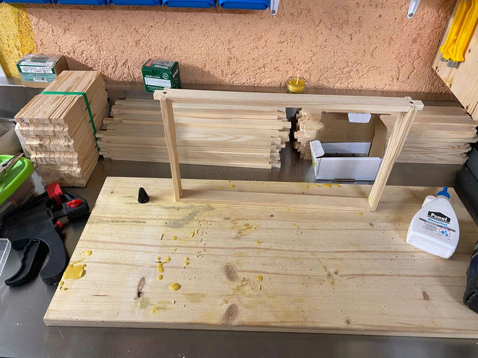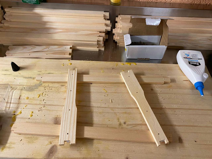 Da es im Februar immer noch winterliche Temperaturen gibt und es an den Bienenbeuten draußen noch nichts zu tun gibt, nutze ich meine Zeit und bastle neue Rähmchen zusammen. Ich kaufe meine Rähmchen teilweise beim Imkereifachhändler ein. So bestelle ich sie in 100er-Abpackungen. Aus dem Baumarkt besorge ich dann Holzleim, der aber wasserfest sein sollte. Wenn ein Rähmchen zusammengebaut ist, drehe ich oben und unten jeweils noch Schrauben hinein, um die Stabilität zu erhöhen. Bis ich meine 120 bis 160 Rähmchen fertig habe, vergeht schon etwas Zeit. Aber das ist ja das Schöne an diesem Hobby, es macht riesigen Spaß. Zum Schluss rechne ich durch, wie viele Rähmchen ich für die kommende Saison in etwa benötige, und lege diese dann für den nächsten Arbeitsschritt beiseite.