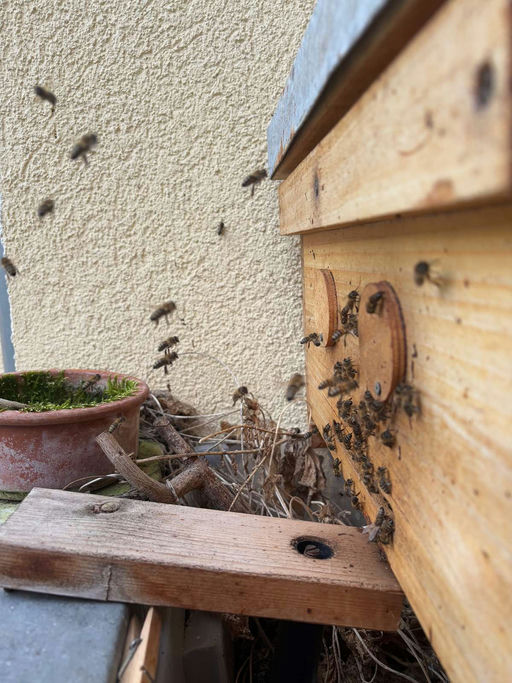 Heute war's bei uns in Berlin nach einigen kalten Wochen das erste Mal wieder über 12 Grad warm. Das haben meine Mädels direkt genutzt, um einen Reinigungsflug zu unternehmen. Bienen sind nämlich sehr reinliche Wesen, die höchst bemüht sind, ihre Notdurft nur außerhalb ihrer Behausung zu verrichten, um die Keimbelastung so gering wie möglich zu halten. Daher füllt sich ihre Kotblase im Winter kontinuierlich und wird nach Möglichkeit, sobald das Wetter es erlaubt (trocken und wärmer als ca. 12 Grad), erst außerhalb des Stocks entleert. Dann fliegen sie in großer Anzahl aus und erleichtern sich. Besonders gerne geschieht dies über hellen Untergründen. Daher ist es ratsam, seine Nachbarn vorzuwarnen, falls diese zu der Zeit draußen Wäsche trocknen, um Flecken vorzubeugen. Denn Bienenausscheidungen sind sehr, sehr farbintensiv (gelb/orange) und zudem recht klebrig.