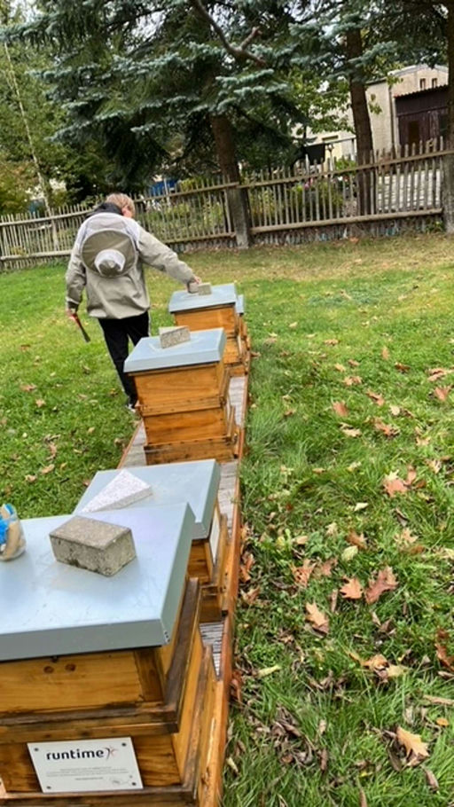 Um zu verhindern, dass die Völker ausgeraubt werden, befestigen wir Schaumstoff vor den Fluglöchern. Dieser schützt die Völker ebenfalls vor Kälte und Schnee. Ein Schaumstoffstreifen hatte sich gelöst. Wir haben einen neuen Streifen angebracht und nochmals überprüft, ob es den Bienen gut geht.