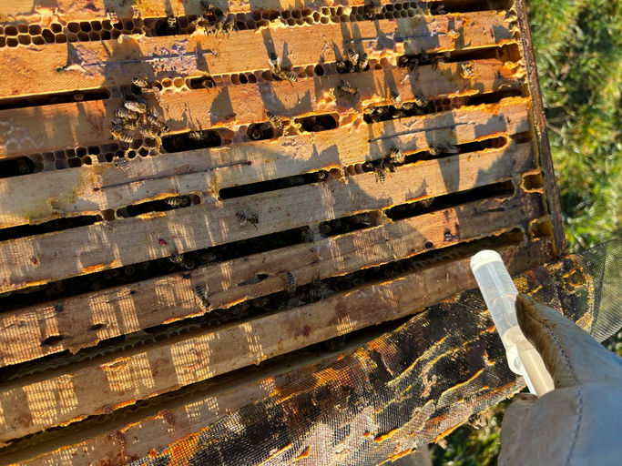 Im Dezember, drei Wochen nach dem ersten Frost, wird die Restentmilbung durchgeführt. Hierfür wird Oxalsäure verwendet. Die Oxalsäure schadet den Bienen nicht und tötet gleichzeitig die restlichen im Volk befindlichen Varroamilben. Gleichzeitig ist es die letzte Kontrolle des Bienenvolks. Unserem Volk geht es auch im Winter gut 😊 Das starke Volk hat somit beste Bedingungen für einen guten Start ins Frühjahr! Wir freuen uns sehr!