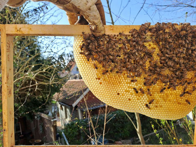 Endlich geht es wieder los. Die Völker haben die im März erhaltenen Drohnenrahmen schon gut ausgebaut. Im April startet die Schwarmzeit. Ab jetzt müssen wir Imker/innen regelmäßig die Völker prüfen, um eventuelle Schwarmzellen zu finden.