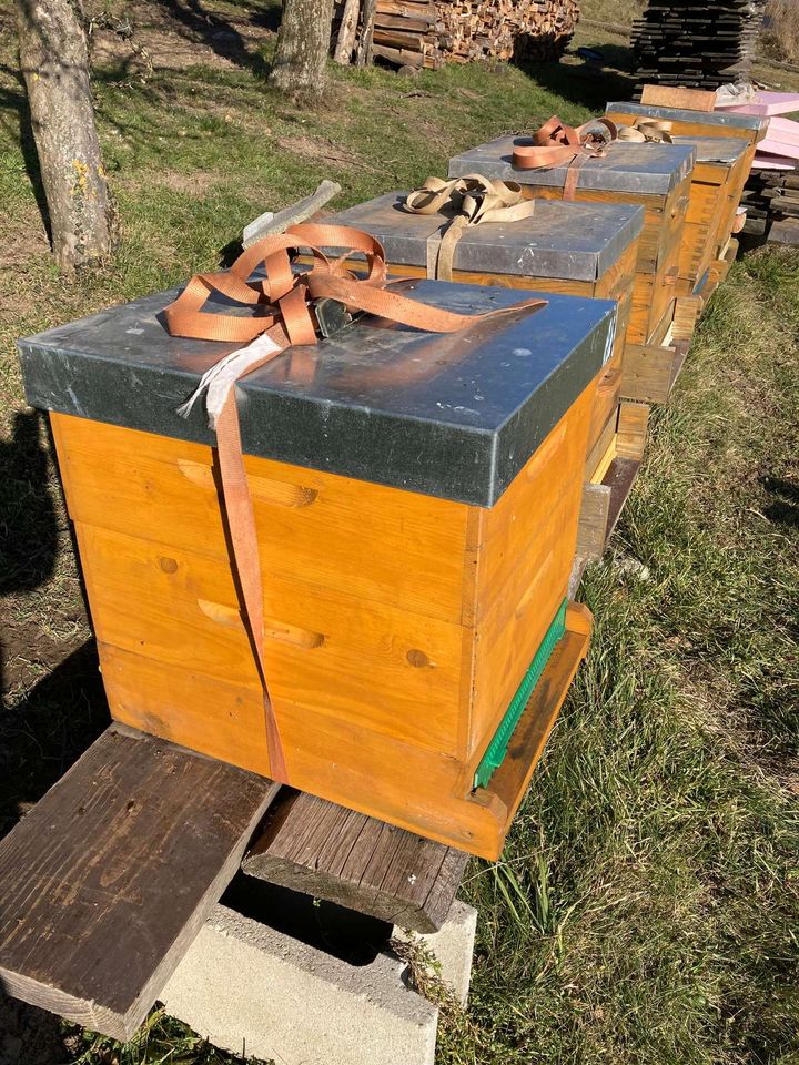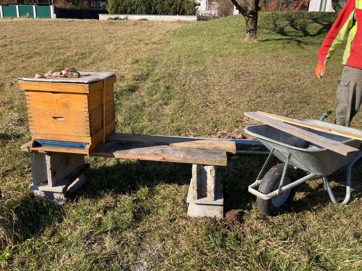 Im Februar ist es eine gute Zeit, um Bienenstöcke zu versetzen, da die Bienen bei kaltem Wetter nicht fliegen und somit nicht desorientiert werden. Die VAV-Bienenstöcke wurden daher um ein paar Meter Richtung Süden umgestellt, um Platz für die Gartengestaltung zu schaffen. Hier sind die Arbeitsschritte: Zuerst den Wärmeschutz abnehmen, den Bienenstock mit einem Spanngurt sichern, den Fluglochschieber auf Sperrposition stellen, den neuen Stand aufbauen, den Bienenstock hintransportieren, den Fluglochschieber auf normale Flugbetriebsposition zurückstellen, das Volk kurz kontrollieren und den Wärmeschutz wieder anbringen. Das Wetter war perfekt: kalt, aber sonnig. Die VAV-Bienen haben den Winter bisher gut überstanden!