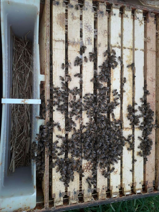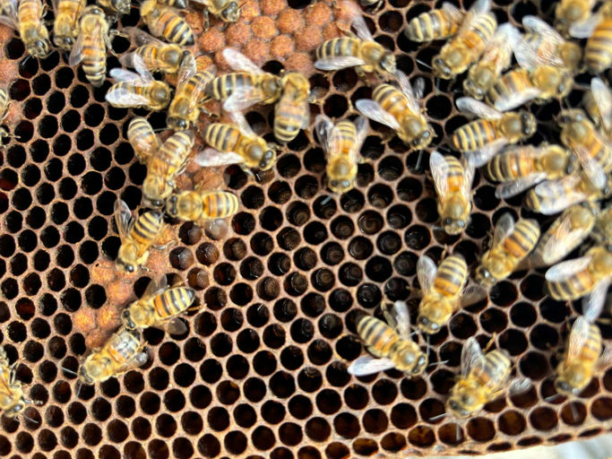 Die Bienen am Centro sammeln zurzeit noch Honig. Junge Bienenmaden sind in den einzelnen Zellen zu sehen, aber es werden noch keine jungen Königinnen herangezogen. Einmal in der Woche kontrollieren wir die Waben in den Völkern danach.