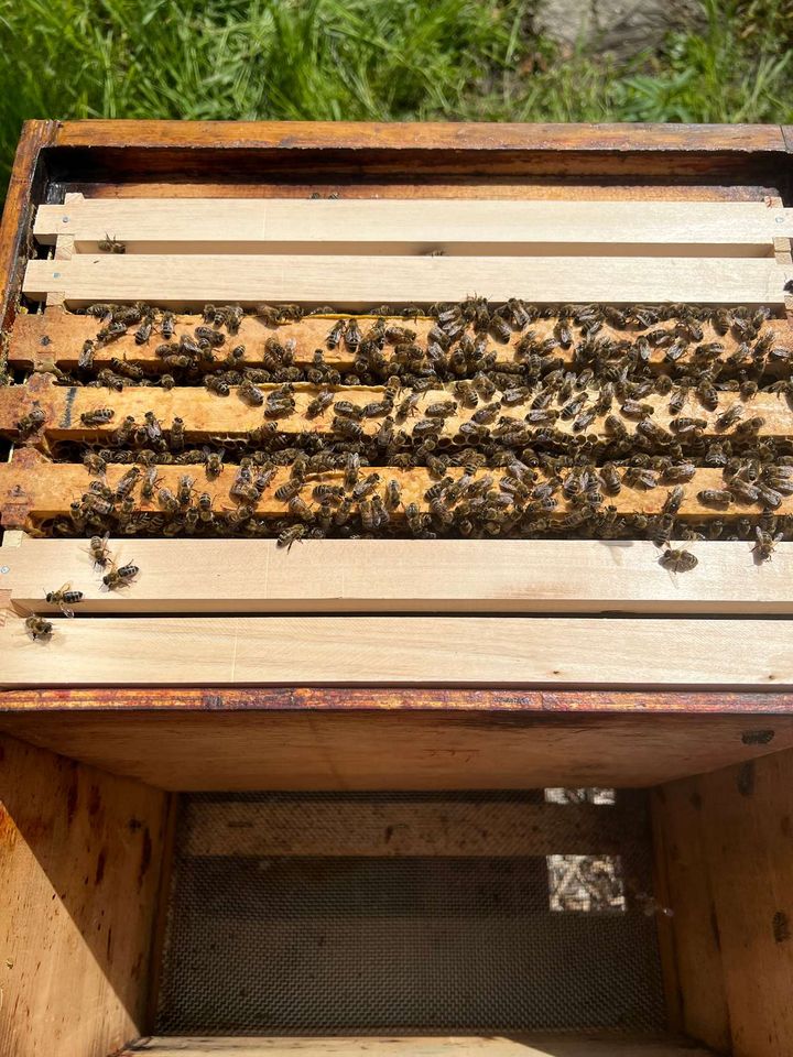Nachdem im April die Honigräume aufgesetzt wurden, muss jetzt von Mai bis Juni zur Hauptschwarmzeit natürlich die Schwarmkontrolle erfolgen. Mein Ziel ist es, den Schwarmtrieb so früh wie möglich zu erkennen bzw. zu verhindern. Das wird nicht immer zu 100 % klappen, aber bis jetzt sieht es sehr gut aus. Um dies zu verhindern, wurden aus dem Volk drei Brutwaben entnommen und durch frische Waben ersetzt. Der Drei-Waben-Ableger entwickelt sich bisher sehr gut, und zwar so gut, dass er einen Honigraum bekommen hat. Bei allen Völkern sind die Honigräume schon sehr gut gefüllt, und das stimmt mich positiv auf eine gute Honigernte.