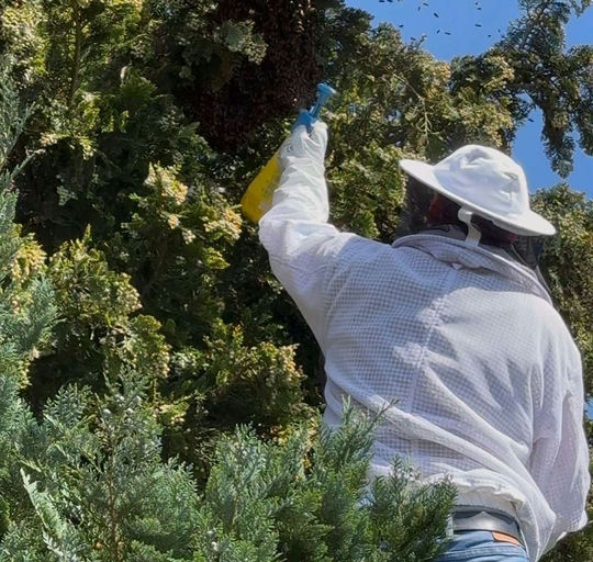 Hoch hinaus ging es für mich, um diesen fremden Schwarm vom Ast zu schütteln und dem Volk ein neues Zuhause bei mir zu geben. Die Melder haben mir freundlicherweise eine lange Leiter zur Verfügung gestellt und mich bei der Arbeit unterstützt.