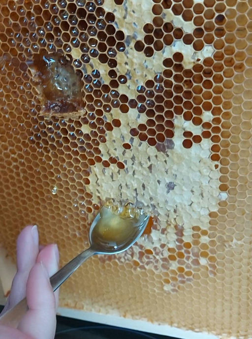 Der Juli war ein heißer Monat. Hitzewellen wurden von Gewittern gefolgt, und es gab weitere Hitzewellen. Die Saison neigt sich nun dem Ende zu. Die Bienen erhalten Varroa-Behandlungen, um diese kleinen Schädlinge zu bekämpfen, damit sie die Bienen im Winter nicht töten. Der Honig wird vorher geerntet, da jetzt die Zeit ist, sie bei Bedarf mit Zuckerwasser oder Fondant zu füttern, damit sie sich auf den kommenden Winter vorbereiten und Vorräte anlegen können. Aus meinem Fehler der letzten Saison habe ich gelernt: Man sollte den Bienen immer genug von ihrem eigenen Honig lassen, den sie mühsam gesammelt haben, und nicht alles entnehmen oder sie zu spät füttern. So habe ich letztes Jahr ein Volk verloren, da sie einfach nicht genug Zeit hatten, den Zuckersirup in eingelagerten Honig für den Winter umzuwandeln. Ich habe die Waben neu angeordnet und ihnen genug von ihrem eigenen Honig gelassen. Hier ist ein Foto von einer Wabe, die wir mit nach Hause genommen haben, um sie zu probieren, und von der Verkleinerung der Völker zum Saisonende.