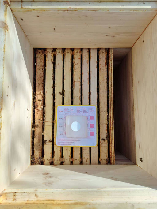 Als Bestandteil der Bienenpflege gehört es unweigerlich dazu, sich um die Varroabelastung im Volk zu kümmern. Die Varroamilbe schädigt Bienen und Brut, da zum einen die Entwicklung der Maden beeinträchtigt wird und zum anderen Krankheiten übertragen werden können. Im schlimmsten Fall kommt es zum Verlust des Volkes, wenn die Varroabelastung zu hoch wird. Während der Bienensaison kann man durch das Entfernen von verdeckelter Drohnenbrut gegen die Varroamilbe vorgehen, da sich hier ein Großteil der Milben befindet. Nachdem die Honigsaison (Ende Juli/Anfang August) vorbei ist, kann bei geeignetem Wetter das Volk mit Ameisensäure behandelt werden. Mit Hilfe des von mir eingesetzten Liebig-Dispensers konnte ich über einen längeren Zeitraum eine gleichmäßige Verdunstung der stark ätzenden Ameisensäure einhalten. Dabei verenden die Varroamilben und fallen von den Bienen ab. Durch eine Varroaschublade im Boden kann der Befall bestimmt und so zu einem späteren Zeitpunkt nochmals reagiert werden.