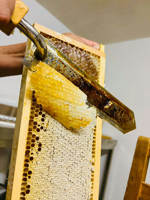 Die Sommertracht ist durch und der Honig ist reif. Das Wetter war leider zu trocken, wodurch die Pflanzen nicht genug Nektar produzieren konnten. Die Sommertracht ist etwa 50 % geringer ausgefallen als die Frühtracht. Dieses Jahr habe ich mit dem elektrisch beheizbaren Entdecklungsmesser die Honigwaben entdeckelt. Im Vergleich zum Frühjahrshonig ist die Sommertracht wesentlich dunkler.