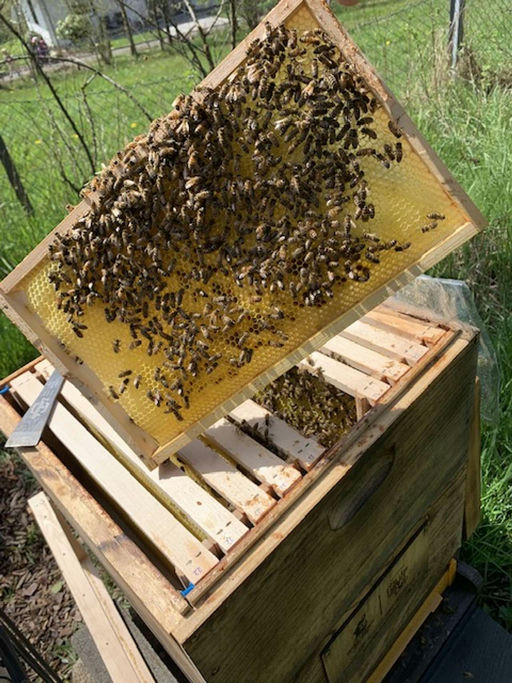 Meine Tochter begleitet mich oft zu den Bienen. Sie hat Spaß daran, Bienen zu streicheln und Blumen für sie zu pflücken. Ich bewundere die kindliche Neugier jedes Mal aufs Neue. Bienen verbinden und bereiten Groß und Klein Freude. Die Bienen haben den aufgesetzten Honigraum angenommen, und dank der Streuobstwiese füllt sich der Honigraum stetig, und die Völker entwickeln sich prächtig. Den ersten Tropfen aus den Honigwaben darf meine Tochter kosten, denn sie ist diejenige, dank der ich damals mit der Imkerei angefangen habe.