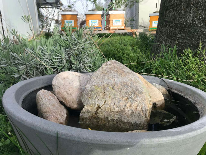 Ab jetzt benötigen die Bienen neben dem Futter auch wieder viel Wasser – ein Bienenvolk benötigt pro Jahr bis zu 30 Liter Wasser! Daher habe ich die Bienentränke kontrolliert und wieder aufgefüllt.