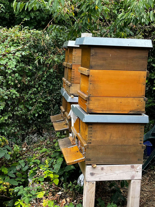 Hallo, ich habe mich in diesem Jahr für die Methode "Teilen und Behandeln" entschieden, um die Varroamilbe zu bekämpfen. Wie ihr auf den Fotos sehen könnt, habe ich jeweils aus einem Bienenstock zwei gemacht. Die unteren sind jetzt nur noch einzargig und schauen mit dem Flugloch weiterhin nach vorn, die oberen sind zweizargig und haben das Flugloch nach hinten. Ich bin zunächst die Stöcke durchgegangen und habe die Königin in einen kleinen Käfig gesteckt. Dann habe ich auf den Boden, der genauso stehen bleibt, wie es die Bienen gewohnt sind, eine Zarge mit zehn sauberen Leerwaben und einer Futterwabe aufgesetzt. Dann kommt die Königin im Käfig, dessen Eingang mit einem Marshmallow verschlossen ist, dazu und ein Deckel drauf. Fertig! Im Laufe des Tages kommen alle Flugbienen unten in die neu aufgesetzte, frische und saubere Behausung und beziehen diese. Die Königin wird rasch freigefressen und beginnt mit der Bestiftung der noch leeren Waben.
