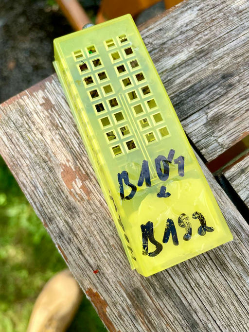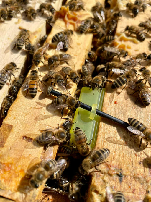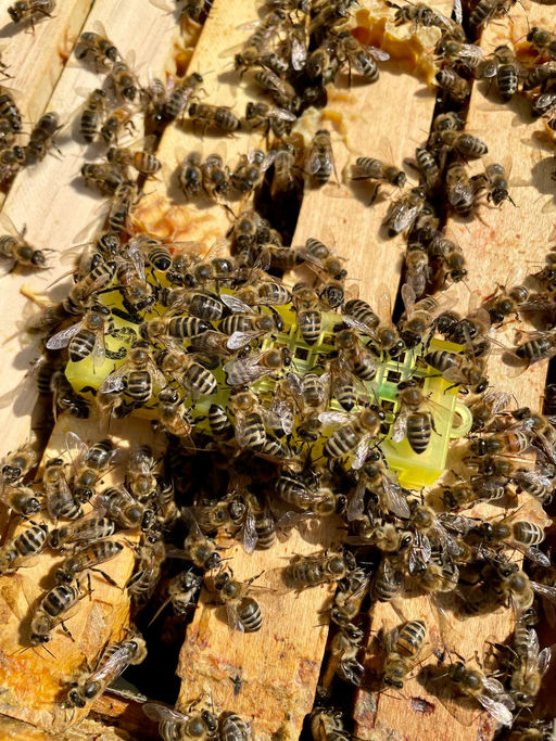 Ich habe einen Tag abgewartet und dann unten am Zusetzkäfig das kleine Plastikteil, wo sich der Futterteig befindet, entfernt. Jetzt wird die neue Königin im Zusetzkäfig in das Volk, zwischen zwei Waben, eingehängt. So können sich die Bienen langsam „beschnuppern“ und die Königin befreien, indem sie den Futterteig von beiden Seiten auffressen. Die Aussichten, dass die Bienen die Königin annehmen, sind bei dieser Methode sehr gut. Ein paar Tage später habe ich dann den Zusetzkäfig langsam herausgenommen, und siehe da, die Königin wurde befreit und befindet sich jetzt im Volk der Bayerischen.