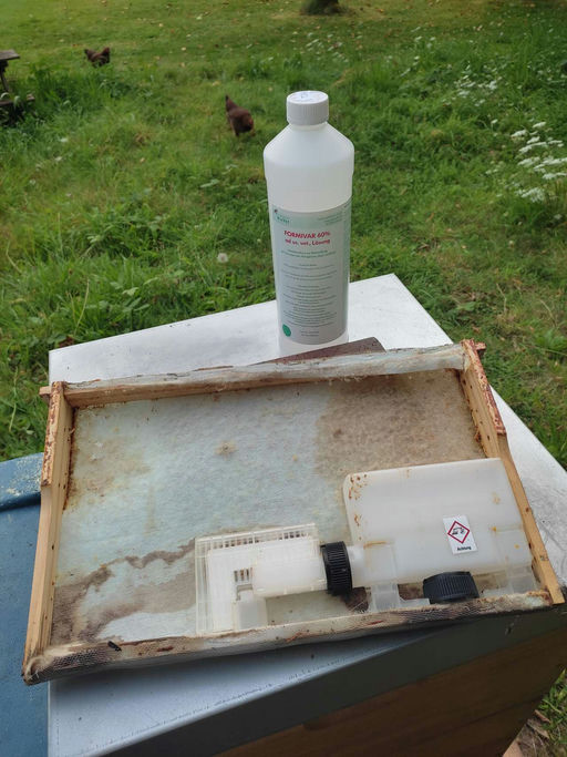 Beim Auszählen im Anschluss ergab sich, dass von meinen vier Völkern drei nur sehr wenige Varroamilben hatten. Nur eines der Völker musste gegen Varroa behandelt werden. Dazu lasse ich in der Beute Ameisensäure (Formivar 60%) verdunsten. Die Milben überleben das nicht, aber die Bienen. Für die Bienen ist der Säuredunst auch nicht schön, aber immer noch besser, als im Winter an den Varroamilben zu sterben.