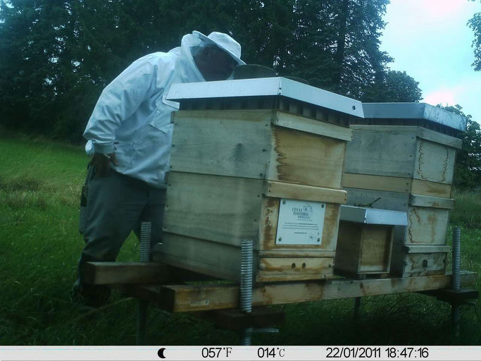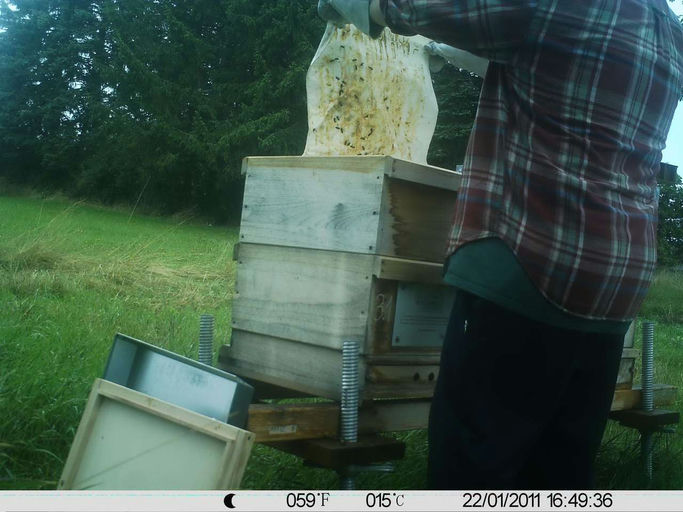 1. **Varroa-Kontrolle**: Diese führe ich mit einer Windel durch. Eine Windel ist eine "Schublade" aus Kunststoff oder Spanplatte, die unter das Bodengitter geschoben wird. Die Varroen fallen, wenn sie tot sind, von den Bienen ab, und man zählt diese aus. Es ist natürlich nur eine Stichprobe, also eine Orientierung. Mit weniger als 5 Varroen pro Tag ist das Ergebnis hervorragend.