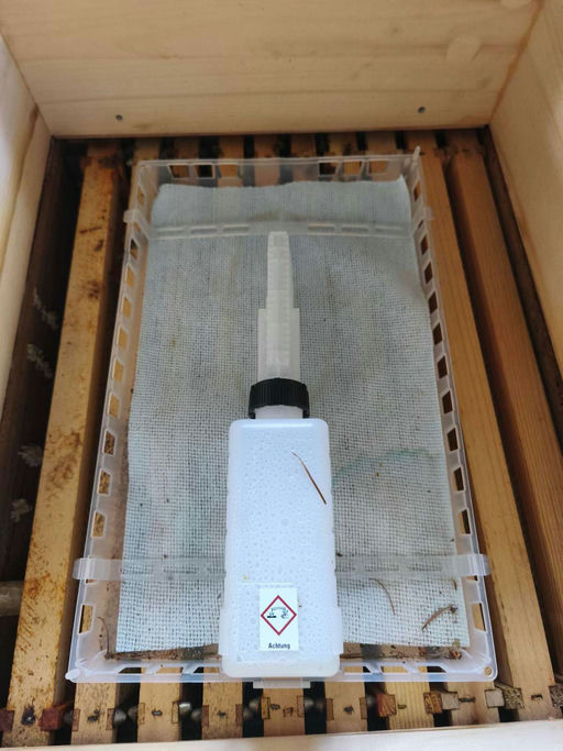 Nach der zweiten Ernte beginnt die Behandlung gegen das ewige Leid, die Varroa-Milbe. Ich habe in diesem Jahr aus allen Völkern einige Brutwaben für neue Ableger entnommen, um so schon die Anzahl der Milben zu reduzieren. Die Milben bin ich zum ersten Mal mit dem Nassenheider Verdunster angegangen. Teilweise hat es gut geklappt, teilweise ist sehr wenig aus dem Fläschchen verdunstet. Wichtig war auch einige Wochen nach der Honigentnahme die Futterkontrolle. Obwohl eigentlich in den Gärten viele Blüten zu sehen waren, musste ich schon Ende Juli die erste Runde Futter geben, da teilweise die Königinnen die Brut reduziert hatten. Mit der ersten Futtergabe hat sich das zum Glück wieder schnell geändert. Jedoch schrumpft mein Vorrat wesentlich schneller als gedacht. Die lange Trockenheit bei uns im Norden ist kontraproduktiv für die Nektarbildung.