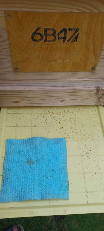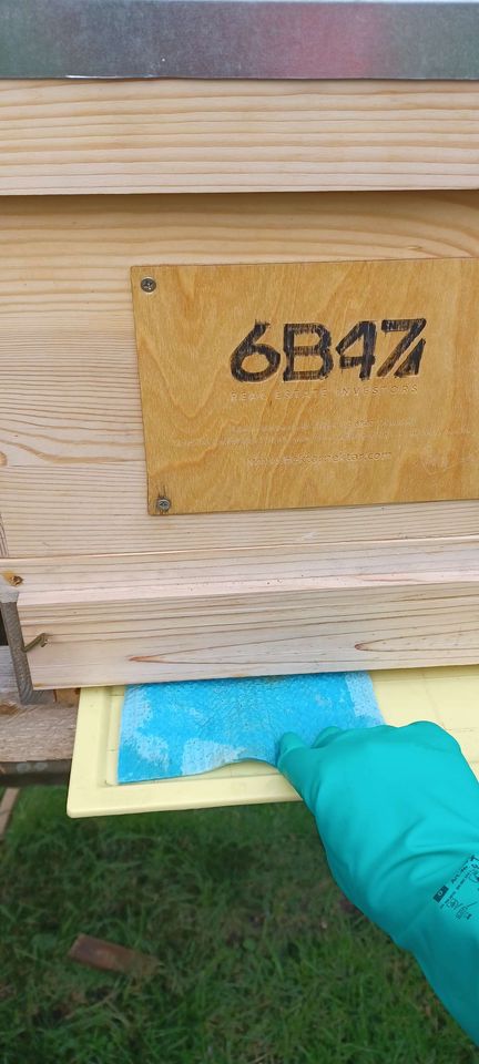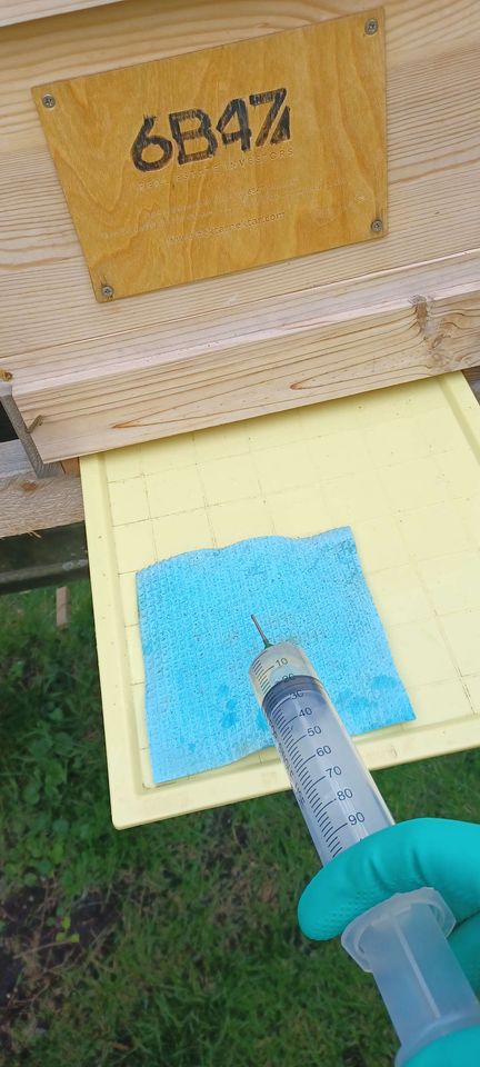Die Varroamilbe ist ein Parasit, der aus Asien eingeschleppt wurde. Sie saugt das Blut der Bienen und lebt ausschließlich im Bienenstock. Durch die starke Vermehrung im Sommer haben unbehandelte Völker meist keine Überlebenschance im Winter. Ich behandle meine Völker mit Ameisensäure. Die Behandlung startet mit 20 ml pro Zarge auf einem eingelegten Schwammtuch. Dies wiederhole ich alle vier Tage fünfmal. Wenn ich nach etwa zwei bis drei Wochen bei einer Varroakontrolle noch einige Milben finde, starte ich die Behandlung ein zweites Mal. Bei der Ameisensäure ist unbedingt eine Schutzausrüstung notwendig.