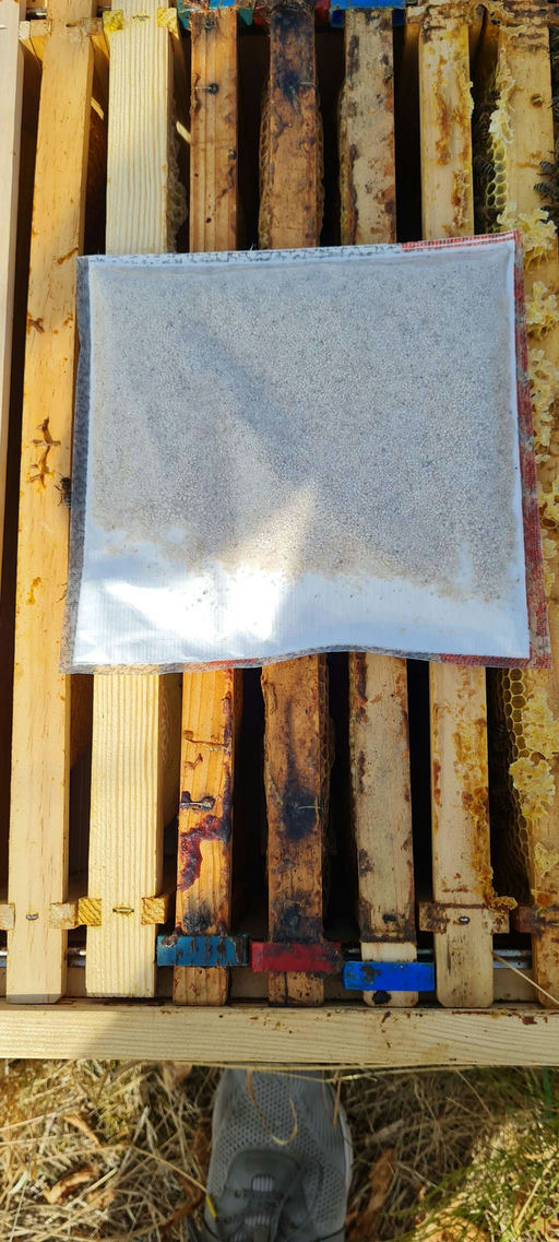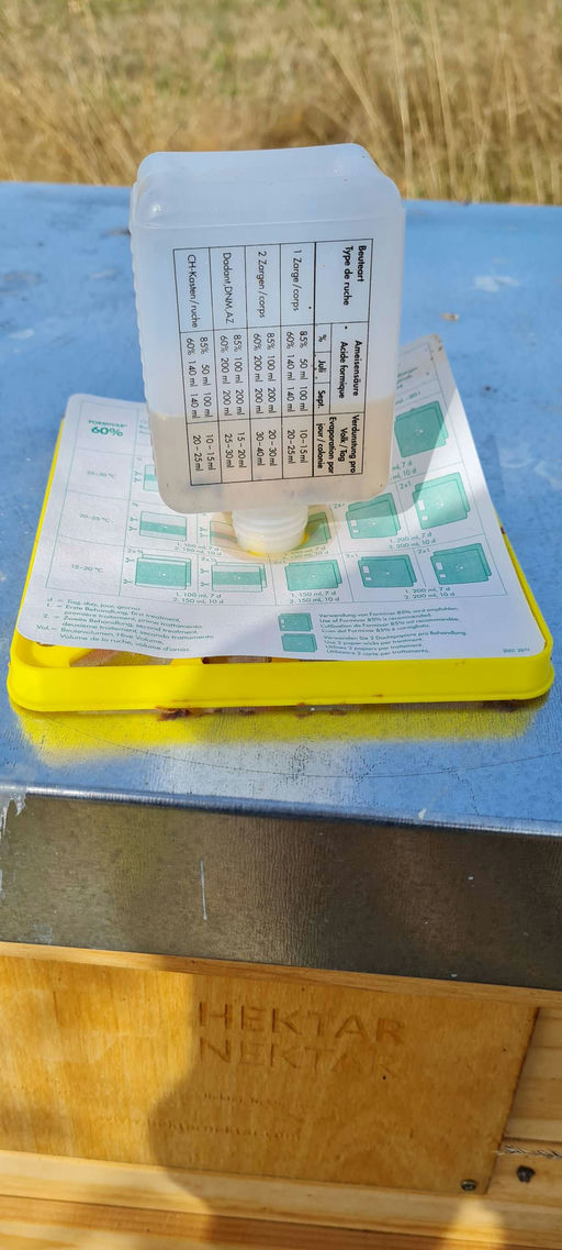 Wenn alles eingefüttert und futtertechnisch stark für den Winter vorbereitet ist, wird eine weitere und vorletzte Varroabehandlung mit Ameisensäure durchgeführt. Dieses Jahr durfte ich an einem Feldversuch teilnehmen, der die Behandlung mit der flüssigen Säure vereinfachen soll. Hierfür wird auf das Volk ein Kissen gelegt, das mit Ameisensäure getränkt ist. Dieses gibt die Säure langsam an das Volk ab, nach dem Prinzip der Verdampfung. Der Imker kommt dabei kaum noch mit der Säure in Berührung. Ich hoffe, dass dieses Produkt auf den Markt kommt.