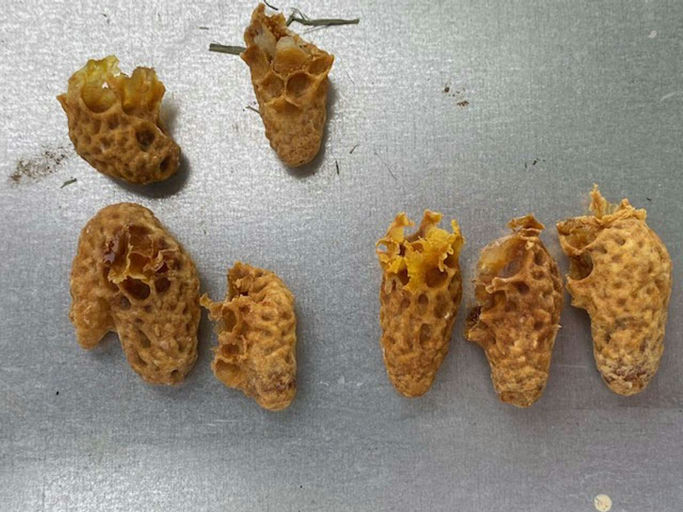 Aus dem oben genannten Grund der Überlebenschance schneide ich die Zellen aus, in denen Königinnen entstehen – die sogenannten Weiselzellen. Daher ist eine Kontrolle auf diese Weiselzellen mindestens alle 7 Tage notwendig.