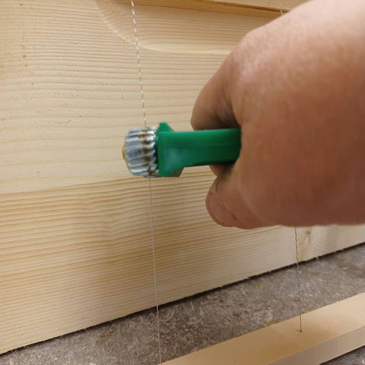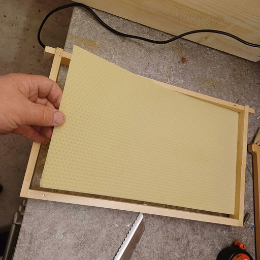 Der Bau der sogenannten Mittelwände ist eine der ersten Arbeiten für das neue Volk. Dabei werden als Erstes die Drähte in den Rähmchen gespannt. Anschließend werden fertige Bio-Wachsplatten mit vorgegebenem Wabenmuster eingelötet. Auf diesen fertigen Mittelwänden bauen dann die Bienen ihre Waben auf, teils für Brut, teils für Pollen und teils für Nektar.