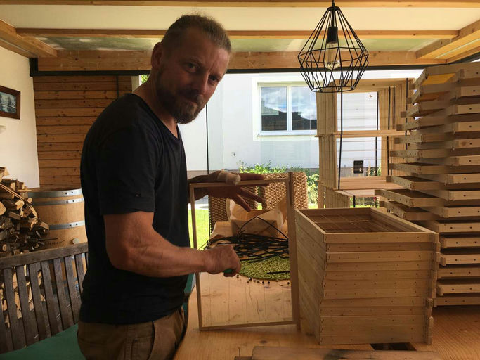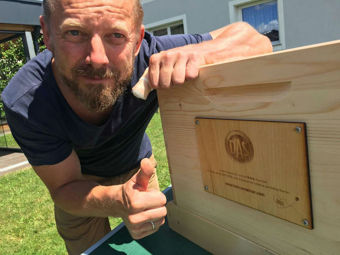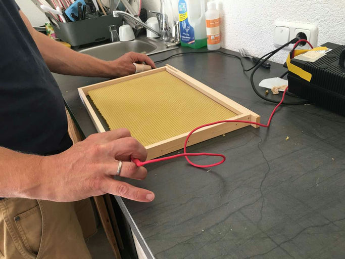 Im Juni wurde endlich die Beute geliefert und die nötigen vorbereitenden Arbeiten durchgeführt. Das Firmenschild wurde montiert und der Draht der Rähmchen gespannt. Anschließend wurde das Wachs eingelötet. Gespannt warteten wir auf den Anruf des Bienenlieferanten, der schließlich Ende des Monats kam. Mein großer Dank geht an die DAS Versicherung für das Sponsoring!