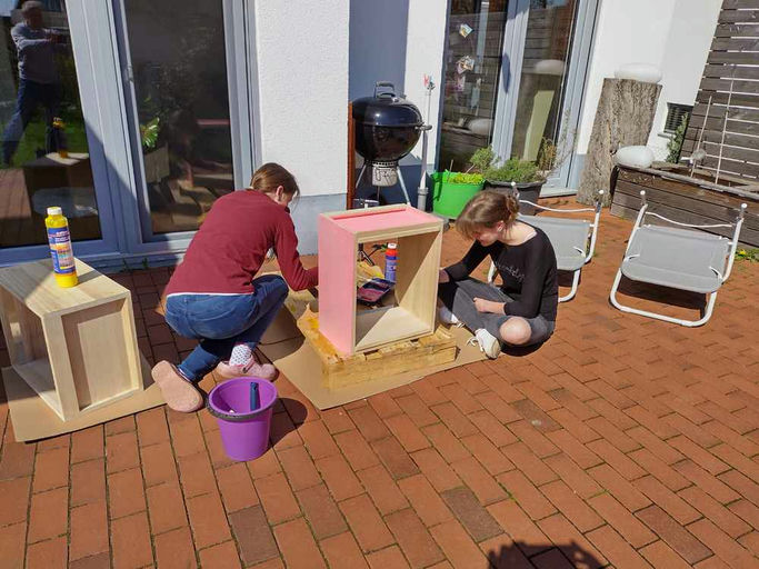 Nachdem die Bienenkiste von Bienen-Annrike angeliefert wurde, konnte bei schönem Wetter endlich ein Schutzanstrich aufgebracht werden. Unterstützung gab es vom Nachwuchs, und deshalb ist die Farbauswahl wohl etwas "weiblicher" geworden. Zuletzt konnte noch das Firmenschild angeschraubt werden. Die Rahmenbedingungen passen schon mal, jetzt fehlen nur noch die Damen...