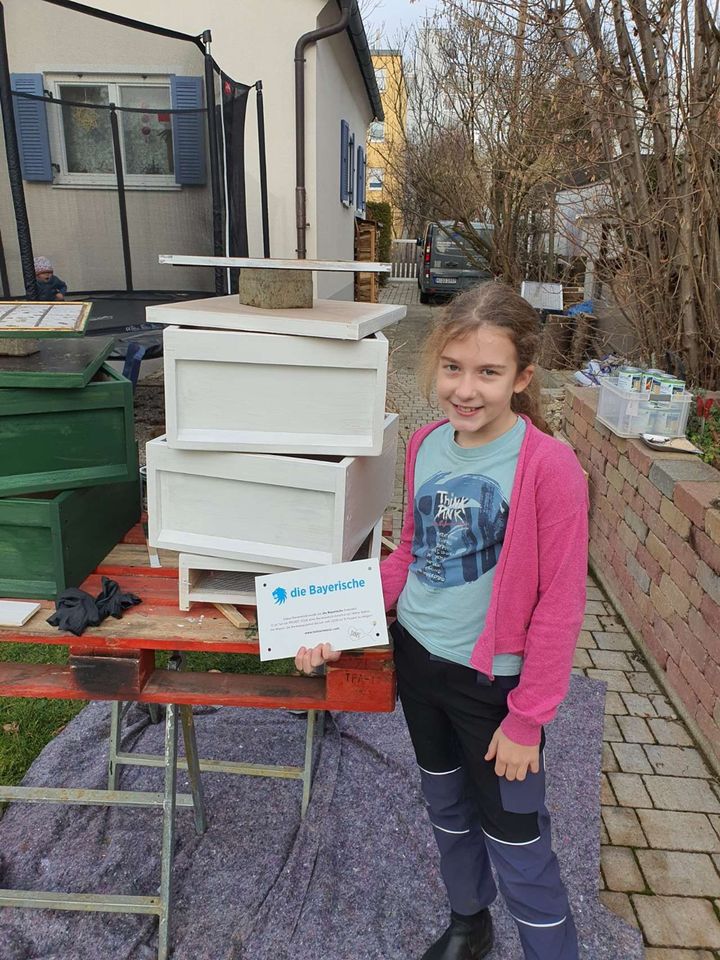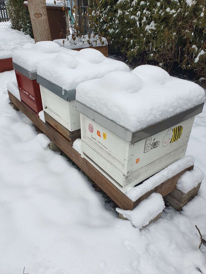 Wintereinbruch am Bienenstand. Es ist Zeit, die Beuten fit für die neue Saison zu machen. Neue Beuten versehen wir mit einem zweifachen Schutzanstrich; die verwendeten Farben sind natürlich unbedenklich für Menschen, Tiere und Pflanzen. Beim Dekorieren sind keine Grenzen gesetzt: Muster an den Fluglöchern erleichtern den heimkehrenden Bienen, die richtige Beute zu finden, und minimieren so den Verflug, insbesondere an Bienenständen mit mehreren, nebeneinanderstehenden Beuten. Rähmchen werden gereinigt und für das Einlöten der neuen Mittelwände vorbereitet.