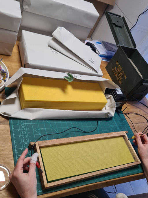 In den letzten Wochen wurde vor allem kontrolliert, wie viel Futter die Bienen noch haben und wie der Wintersitz der Bienentraube ist. Durch einige milde Wochen sind sie bereits wieder in Brut, die es zu wärmen gilt. Dadurch erhöht sich auch der Futterverbrauch. Da es nun wieder kalt geworden ist, besteht die Gefahr, dass sie nicht mehr ans Futter kommen, wenn die Bienentraube den Sitz der frischen Brut nicht mehr verlässt. Da können wenige Zentimeter schon ausschlaggebend sein, ob sie verhungern oder nicht. Kürzlich haben wir auch unsere Mittelwände, die wir aus Eigenwachs fertigen lassen haben, bekommen, die wir in die gereinigten und ersetzten Rähmchen gelötet haben. Kleine Rähmchen haben wir zur Wabenhoniggewinnung zusammengebaut und mit einem kleinen Wachsstreifen als Bauhilfe versehen. Momentan wächst die eigene Sehnsucht und Ungeduld nach dem ersehnten Frühling und wird ein wenig durch das Wälzen von Fachbüchern, den Besuch von Fachmessen und die Planung gemildert.