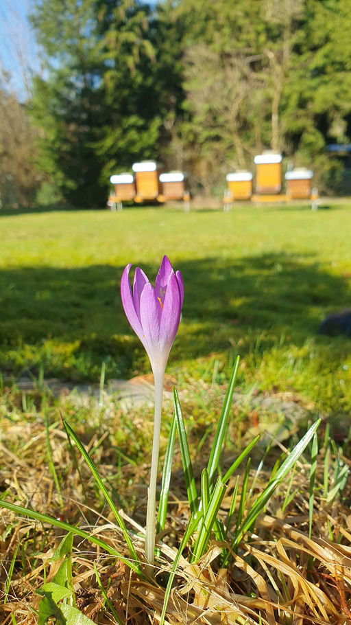 Der Vorfrühling beginnt durchschnittlich Mitte Februar. Man merkt es daran, dass die Haselnusssträucher blühen und sich Schneeglöckchen und Krokusse zeigen. Diese Pflanzen dienen den Bienen als erste Nektar- und Pollenlieferanten, die die Bienen ab etwa 10 Grad sammeln. Pollen bestehen zum Großteil aus Eiweiß und sind wichtig für die Brut. Die Königin im Volk legt nun nach der "Winterpause" wieder deutlich mehr Eier. Dadurch wächst das Volk langsam wieder an und verbraucht aber auch mehr Futter. Die Bienen sammeln den Pollen an den Hinterbeinen. Den kleinen gelben Knubbel nennt man auch Pollenhöschen.