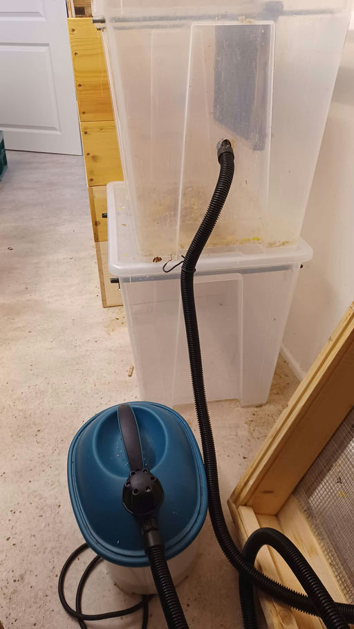 Jetzt im Winter ist es Zeit, die alten Brutwaben einzuschmelzen und das Wachs zu reinigen. Ich verwende dafür einen Dampfwachsschmelzer, den ich selbst gebaut habe. Der Dampf wird in eine Wanne eingeblasen, in der die alten Waben liegen, und durch die Wärme schmilzt das Wachs und wird durch eine Stoffwindel gefiltert. Da das Wachs leichter ist als das Wasser, schwimmt es oben auf und kann nach dem Abkühlen als Block entnommen werden.
