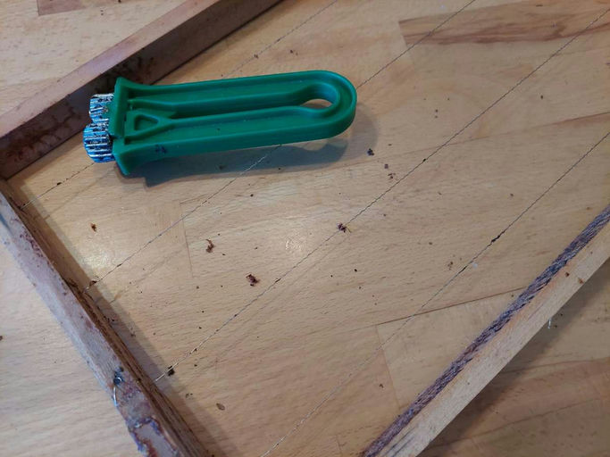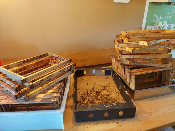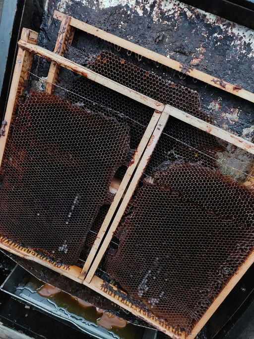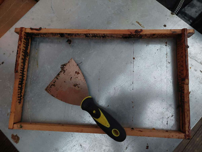 Nach dem Verschließen mit dem Plexiglasdeckel erledigt die Sonne den Rest. Die Sonne erhitzt das Wachs, welches dann über ein Gitter in eine Auffangwanne fließt. Danach werden die Rähmchen mit den Resten der Waben (Pollen, Puppenhäutchen, Bienenteile, …) herausgenommen und vorerst grob mit einer Spachtel gereinigt. Kaputte Rähmchen werden repariert oder ausgetauscht.