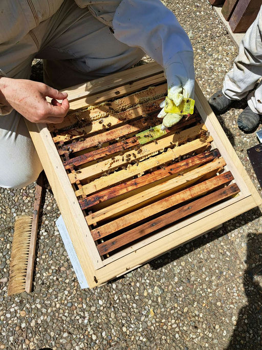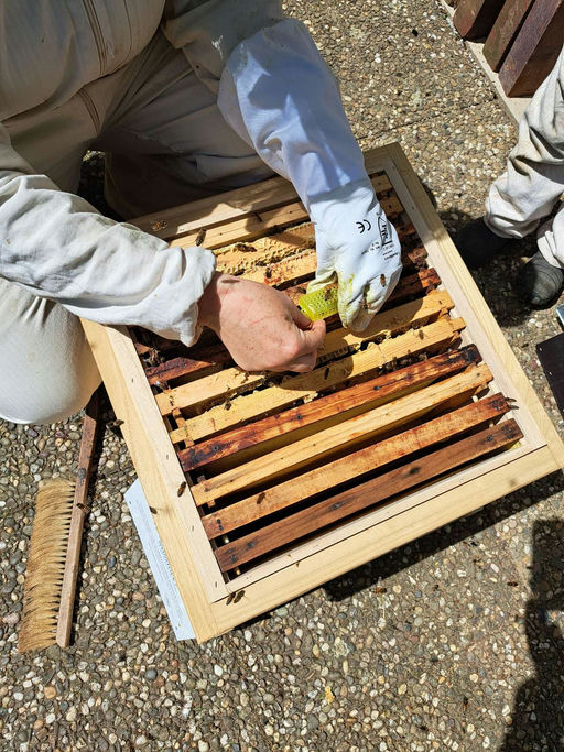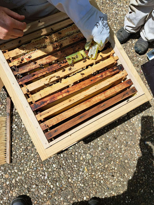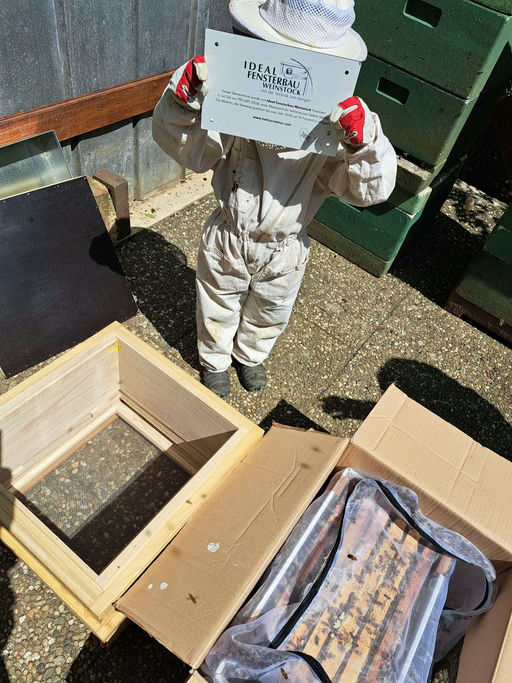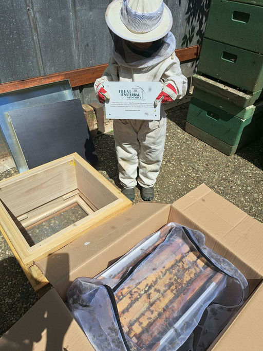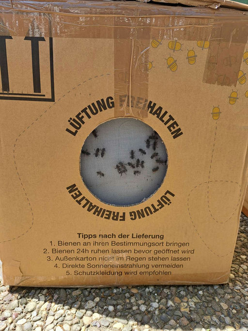Gerade eben ist es endlich eingetroffen: unser neues Bienenvolk! Auf den Fotos ist der tolle, bienenfreundliche Versandkarton zu sehen (tatsächlich waren die Bienen sehr entspannt, als sie ankamen). Außerdem sieht man den kleinen gelben Käfig, in dem die Königin mit ein paar pflegenden Bienen zur Sicherung während des Transports geschützt war – und wie sie von dort ins Volk schlüpft (wer findet die rote Markierung als Kennzeichnung der Königin aus 2023?). Auf dem letzten Foto sieht man Bienen am Flugbrett "sterzeln" – sie recken den Hinterleib in die Höhe und wedeln mit den Flügeln. So verteilen sie den Duft ihrer Königin, sodass auch alle Bienen den Weg ins neue Zuhause finden. Jetzt fliegen sie sich ein und stillen erst einmal den Durst von der Reise.