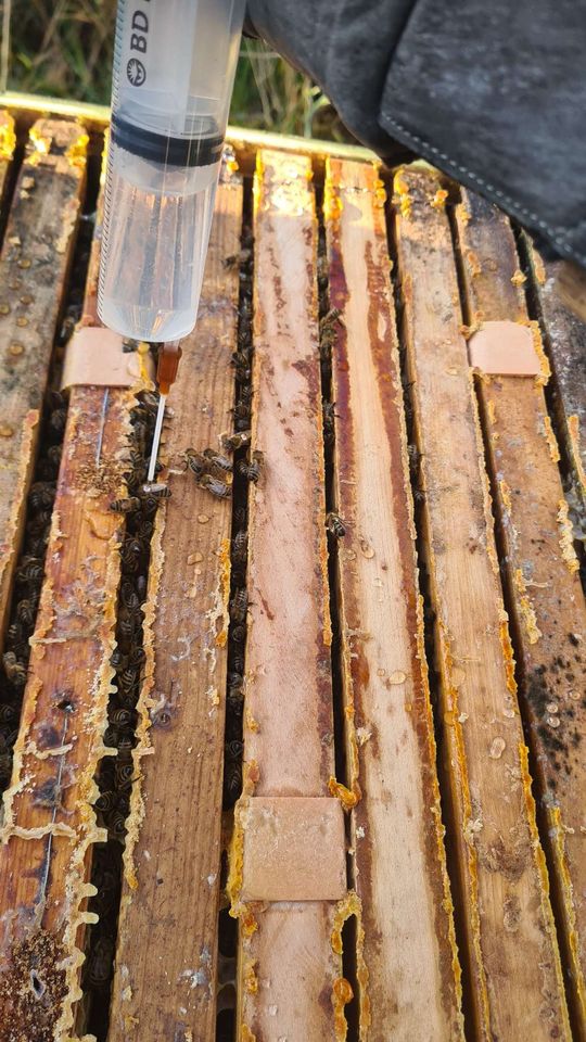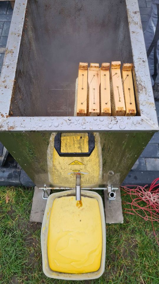 Auch im Winter muss einiges rund um die Bienen getan werden. Alte Waben wurden ausgeschmolzen und das Wachs anschließend zu Mittelwänden umgearbeitet. Zudem stand die Winterbehandlung der Bienen an. Dabei wird Oxalsäure auf die Traube der Bienen geträufelt, um diese zu entmilben. Dazu darf jedoch keine Brut vorhanden sein.