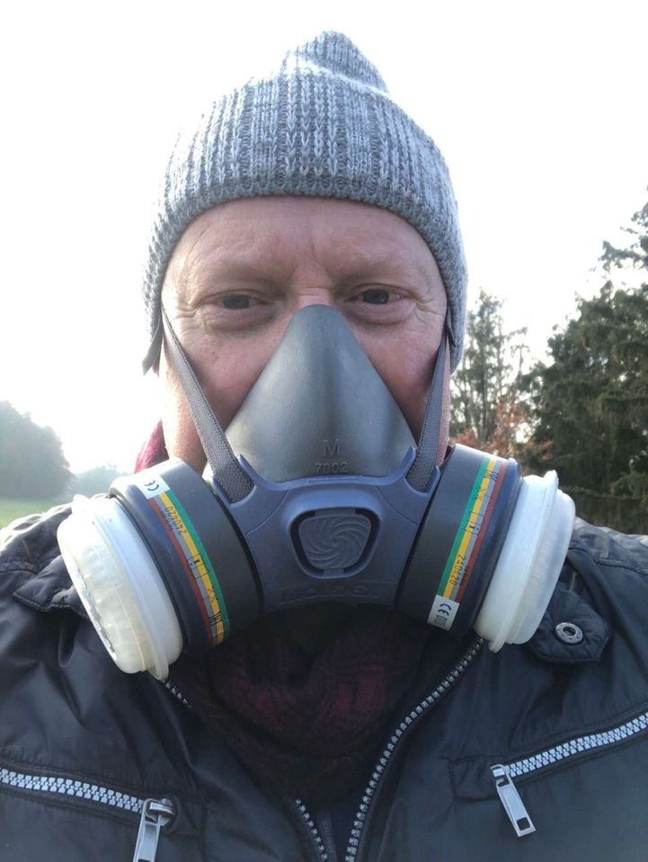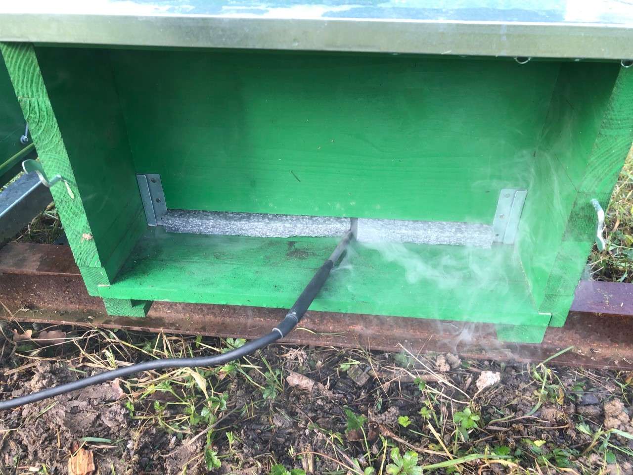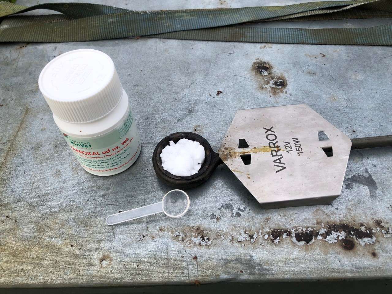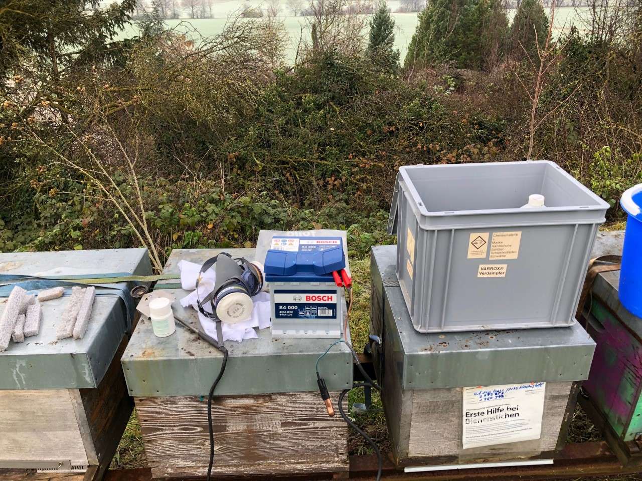 Ich behandle mit dem Varrox-Verdampfer. Ich erachte es als Vorteil, dass ich von vorne durch die Öffnung arbeiten kann und die Magazine oben nicht öffnen muss. Öffne ich oben, haben die Völker einen enormen Wärmeverlust, den sie wieder wettmachen müssen. Das heißt, sie benötigen wertvolles Futter, welches dann eventuell im Frühling fehlen könnte. Auf meinen Bildern seht ihr: Zuerst bereite ich alles für die Arbeiten auf den Magazinen vor, dann fülle ich den Verdampfer ab und schiebe ihn in das zu behandelnde Magazin hinein. Alles gut verschlossen, verdampft das Pulver und ich schütze mich gegen die Dämpfe, wie vorgeschrieben.