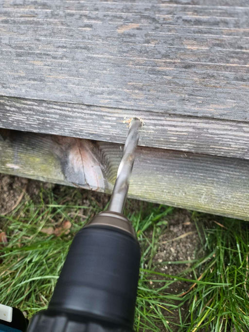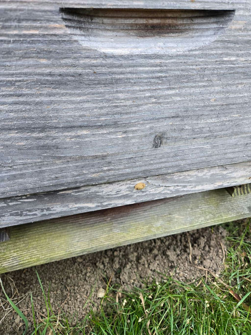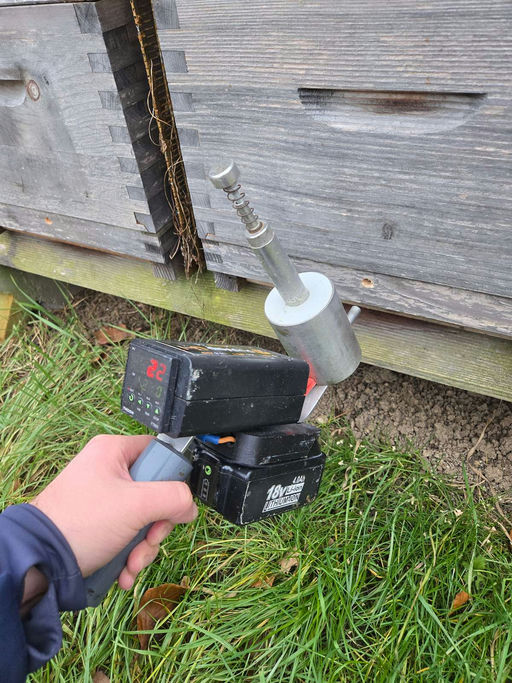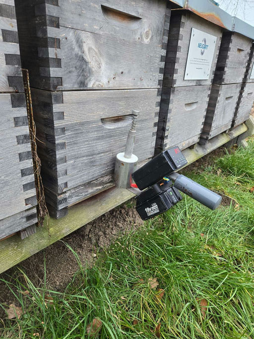 Die Oxalsäure, die auch im Rhabarber vorkommt, wirkt gut gegen die Milben. Bisher wurde diese flüssig auf die Bienen gespritzt, ab jetzt wird sie jedoch mit einem Akkuverdampfer in die Beute geblasen – das wirkt besser und schädigt weniger Bienen. Um den Dampf einzublasen, musste mit der Akkubohrmaschine noch ein Loch in den Beutenboden gebohrt werden. Nach der Behandlung wurde das Loch mit Schaumstoff verschlossen, damit die Bienen später nicht den falschen Ausgang nehmen.