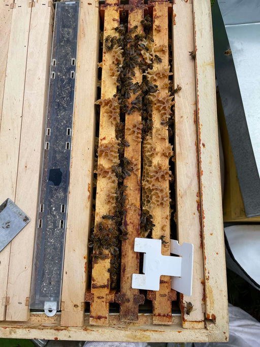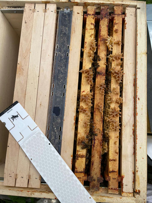 Dieses Jahr probiere ich neben dem Einsatz des Bücherskorpions gegen die Varroamilbe die neu zugelassenen Oxalsäurestreifen aus. Das Ablegervolk ist friedlich. Die Entwicklung geht ganz gut voran, es war aber nicht genügend Futter vorhanden, um die Winterbienen ausreichend ernähren zu können. Ich habe also erst einmal Futterteig aufgelegt und den Oxalsäurestreifen eingehängt. Dieser bleibt sechs Wochen im Volk. Da das Ablegervolk noch nicht sehr groß ist, habe ich nur einen Streifen in die Beute gehängt und werde die Behandlung gegebenenfalls wiederholen.