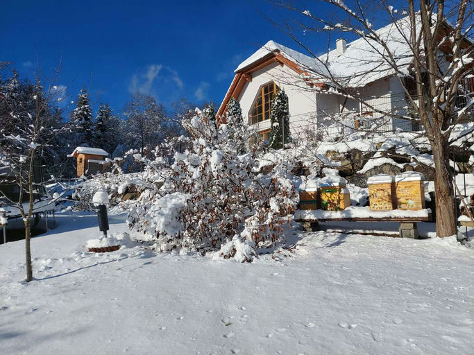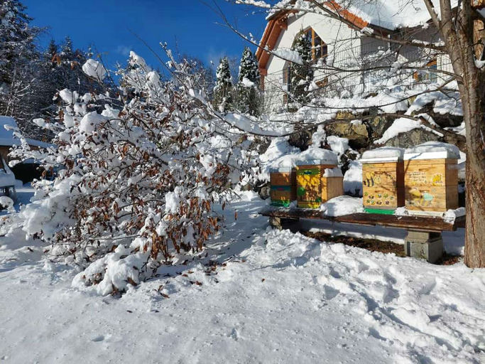 Aufgrund des starken Schneefalls waren die Fluglöcher der Bienenstöcke zugeschneit und zugefroren. Um den Bienen bei Bedarf das Ausfliegen zu ermöglichen, haben wir den Schnee vor den Fluglochschiebern weggeputzt. Die Kraft der Sonne tut nun ihr Übriges, um das Eis wegzuschmelzen.