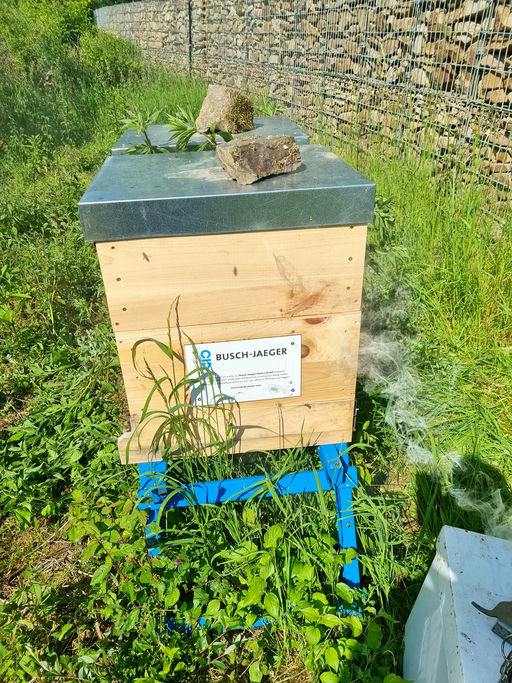 Vereinzelt sieht man noch ein paar Busch-Bienen herumfliegen, aber jetzt wird es deutlich kühler. Die Bienen sitzen in der Wintertraube. Jetzt ist es wichtig, die Restentmilbung durchzuführen, damit die restlichen Milben, die aus der Brut geschlüpft sind und auf den Bienen sitzen, abgetötet werden.