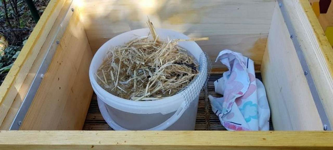 Ende August wurde mit der Winterfütterung begonnen. Da die Bienen im Winter keinen Nektar und keinen Pollen finden, versorgt man sie mit hochwertigem Zuckersirup oder Futterteig. Der Honig wurde ja vom Imker entnommen, sodass der natürliche Vorrat der Bienen gering ist. Damit die Bienen genug Zeit haben, das Futter zu verarbeiten und einzulagern, beginnt man damit meistens im Spätsommer. Um die Bienen vor dem Ertrinken im Zuckersirup zu bewahren, gibt man Schwimmhilfen mit. Sektkorken aus Kork eignen sich hervorragend, Äste funktionieren ebenfalls sehr gut. Wichtig ist, dass die Bienen über der Flüssigkeit sitzen können. Bei fünf Völkern sollte man gleichzeitig füttern, damit im wahrsten Sinne des Wortes kein Futterneid entsteht und die Bienen anfangen, beim Nachbarn zu räubern.