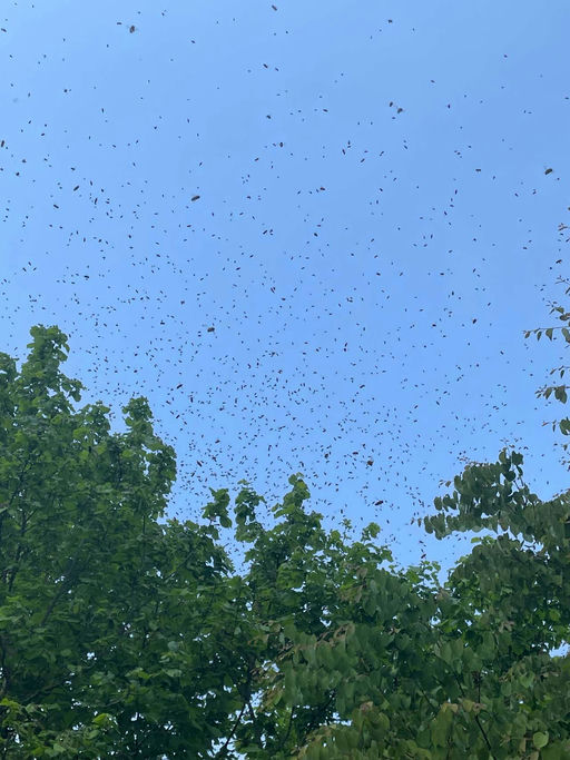 So bin ich auch dieses Jahr schon wieder mehrfach für die Schwarmrettung unterwegs gewesen, um Bienentrauben zu pflücken, den Völkern ein neues Zuhause zu vermitteln und interessierten Mitmenschen zu erklären, dass Schwarmbienen die friedlichste Version der Honigbienen sind. Denn als solche haben sie weder Haus, noch Hof, noch Brut zu verteidigen. Und sie haben den Magen voll mit Honig (satt macht zufrieden). So schwärmt die Honigbiene also wohl eher mit als für Honig ;)