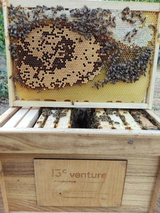 Da sich der Ableger gerade bei der Volksentwicklung nicht komplett selbst mit Futter versorgen kann, helfe ich mit einer wöchentlichen Futtergabe von Zuckerwasser nach. Die Zuckerlösung wird zu dieser Jahreszeit immer sehr gut angenommen und in kürzester Zeit von den Bienen in die Waben eingelagert. Sobald das Futter von den Bienen umgesetzt wurde und die Zellen voll genug sind, werden diese mit einer dünnen Wachsschicht verschlossen und so länger haltbar gemacht. Ein regelmäßiger Futterstrom regt die Königin zu einer höheren Legeleistung an, und der Ableger kann so mit einer höheren Anzahl an Bienen in den Winter gehen.