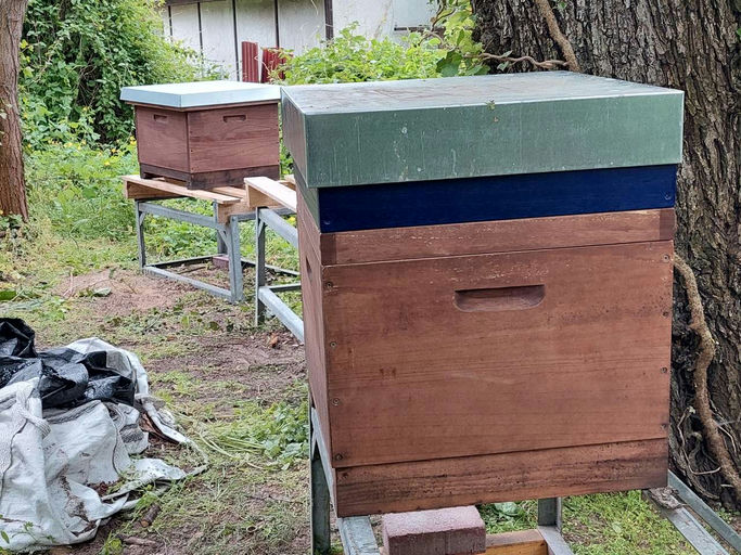 Das TELUS-Volk war wohl nicht sehr zufrieden mit seiner Königin, denn sie haben sich zwei neue gemacht. Die alte Königin wurde vermutlich rausgeschmissen oder abgestochen, denn sie war bei der letzten Durchsicht nicht zu finden. Die Chance habe ich genutzt, um aus dem Volk mit einer Weiselzelle einen Ableger zu bilden. Die andere Weiselzelle verbleibt in der TELUS-Beute. Um die Futterversorgung des Ablegers sowie der TELUS-Bienen sicherzustellen, habe ich jetzt Futter zugeführt und den Honigraum abgenommen, um den darin befindlichen Honig nicht zu verfälschen. Es soll ja echter Bienenhonig werden und nicht so ein verfälschter Supermarkt-Honig.